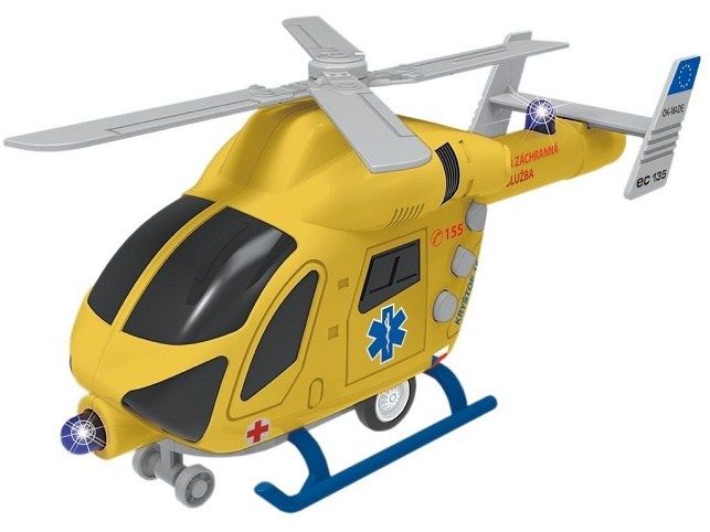 Vrtulník ambulance v českém designu s českým hlasem. Simuluje rozhovor dispečinku a pilota: Dispečink: Hromadná nehoda na čtyřicátém kilometru dálnice. Na místě jsou ranění. Ihned se připravte k odletu. Pilot: Cíl na dohled. Zahajuji sestup. Připravte se k zásahu. Vrtulník je na setrvačník a obsahuje světelné a zvukové doplňky. Funkční maják. Rozměry boxu 23 x 13,5 x 10 cm. Český box Vrtulník je napájen bateriemi 3x AG13 (jsou součástí balení). Vhodné pro děti od 3 let