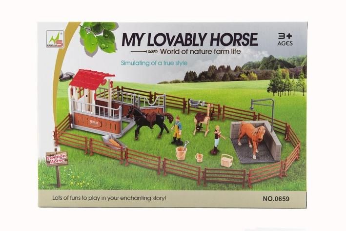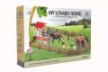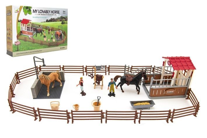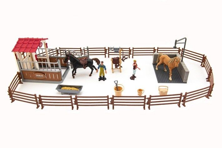 Sada pro všechny milovníky koní. Sestavte si vlastní stání s ohradou a mnoha doplňky, které potřebujete pro péči o koně. Koníčky můžete osedlat, osprchovat, vyčistit a nakrmit. Sestavte si reálnou koňskou farmu. Vše vyrobeno z kvalitního a odolného plastu.