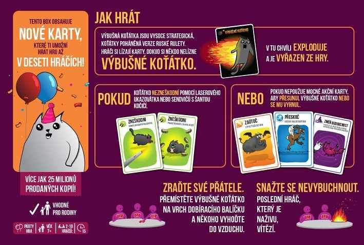Pořádnou párty je potřeba začít ve velkém stylu!""Historické okénkoVýbušná koťátka je hra s historicky nejvíce přispěvateli na Kickstarteru. Hru vytvořili Elan Lee (XBOX, ARGs), Matthew Inman (The Oatmeal) a Shane Small (XBOX, Marvel), kteří přepsali historii Kickstarteru, když v roce 2015 na jejich projekt přispělo více než 219 000 backerů (přispěvovatelů). K roku 2023 se prodalo více než 25 miliónů kopií Výbušných koťátek po celé světě. O hře Výbušná koťátkaVýbušná koťátka jsou extrémně strategickou verzí ruské rulety (jen s koťátky). Hráči si dobírají karty, dokud si někdo nelízne Výbušné koťátko, exploduje, umře a je vyřazen ze hry. Pokud ten hráč nemá kartu Zneškodni, která mu umožní zneškodnit koťátko pomocí laserového ukazovátka, podrbáním na bříšku nebo sendviče s šantou kočičí. Úkolem všech ostatních karet v balíčku je pomoci hráčům držet se Výbušným koťátkům z cesty (nebo je nastrčit do cesty ostatním). V čem je tato edice jiná?Toto balení obsahuje pořádnou porci karet (oproti Originální edici také karty s novými efekty), díky kterým si můžete zahrát hru až v deseti lidech!Obsah balení: 120 karet 1 česká pravidla