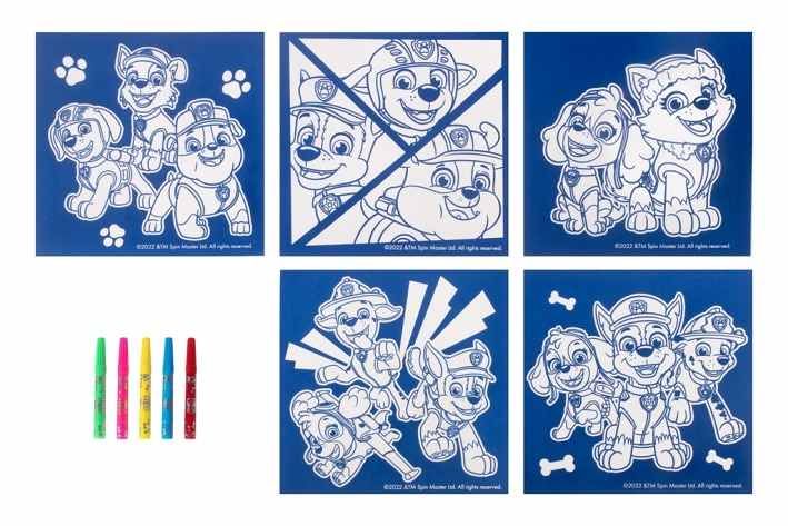 Vymalovávací obrázky Tlapjková patrola – balení obsahuje 5 vymalovávacích obrázků a 5 ks fixek.