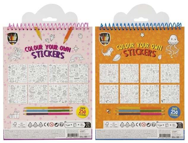 Vymaluj si svoje samolepky – je sada samolepek – dva druhy včetně oboustranných pastelek (3 ks). Dva druhy knih se samolepkami.