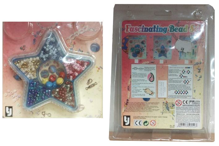 nevhodné pro děti do 3let, plastový obal je zašlý, místy prasklý. Velikost balení 22x17cm, velikost hvězdy 12x10 cm. Obsahuje deset barev korálků + 6x rolnička.