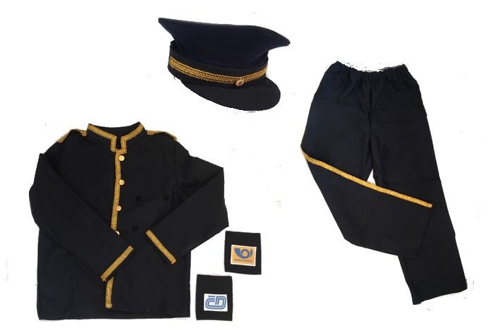 Kostým na karneval Pošťák nebo železničář. Na saku je nášivka s logem České Pošty nebo Českých drah (lze ji vyměňovat).