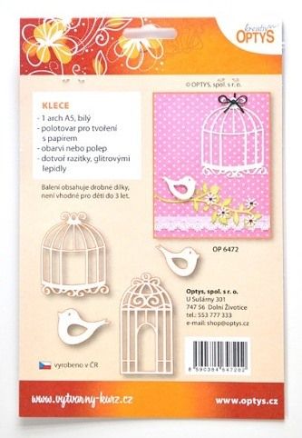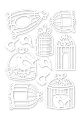 v balení 1 arch, který obsahuje 7 ks ptačích klecí různých velikostí a 4 ks malých ptáčků
