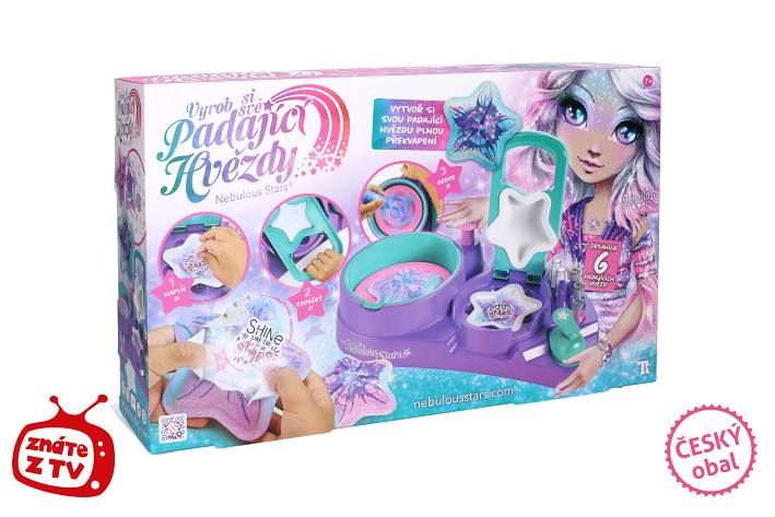 Vyrob si své padající hvězdy - český obal. Obsah - balení - přístroj na výrobu padajících hvězd, 12x hvězdička z buničiny, děrovač ve tvaru hvězdy, 3 lahvičky s barvou, 2 lahvičky s inkoustem, 4 archy s inspirativními zprávami, 12 archů hedvábného papíru, tuba se třpytivým práškem, tuba lepidla, 64 korálků, 6 šňůrek, příběh Estrelie.