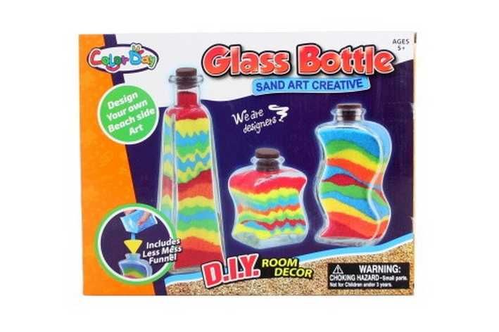 Kreativní sada obsahuje 3 skleněné lahvičky různých tvarů a velikostí - od 6 cm do 15 cm, 5 sáčků barevného písku, plastovou násypku na sypání a plastový nožík na úpravu písku v nádobě. Rozměry balení cca 30 x 24 x 7 cm. Věk 5+