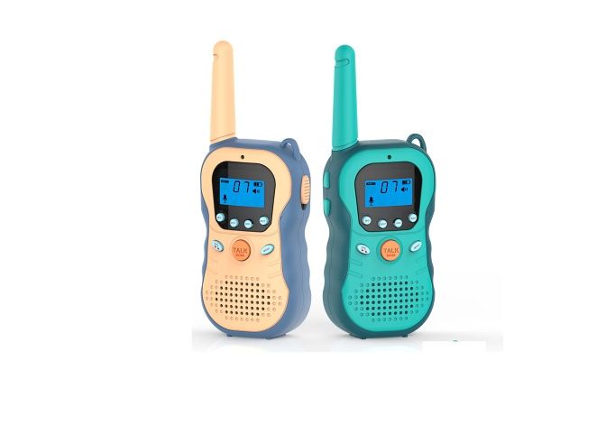 Vysílačky dětské. Rozměry 6x2,8x16 cm. Dosah až 3 km. Rádiové vlny. 4 druhy (normální, mužský, ženský, robotí). 8xAAA baterie (4xAAA do každé vysílačky) nejsou součástí. Přepínač ON/OFF na pravé straně vysílačky. Oranžové tlačítko - pro mluvení. Tlačítka ovládání hlasitosti (nahoru a dolů v menu) na levé straně vysílačky. Návod součástí.
