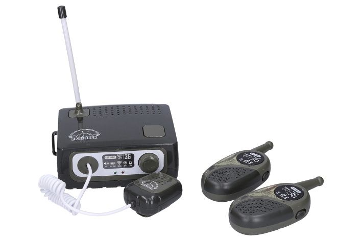 Vysílačky se stanicí. Rozměr stanice 17x11x6,5 cm. Dosah 300 m. Součástí 2 vysílačky, vysílací stanice. Stanice má nastavení hlasitosti. 1x9V baterie pro stanici, 3xAAA pro každou vysílačku nejsou součástí.