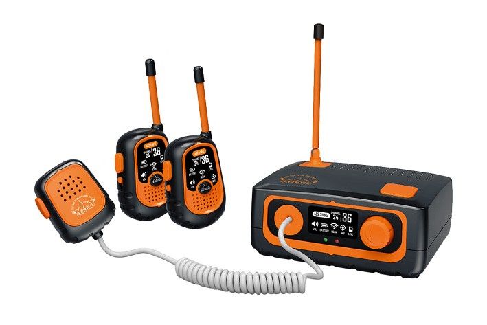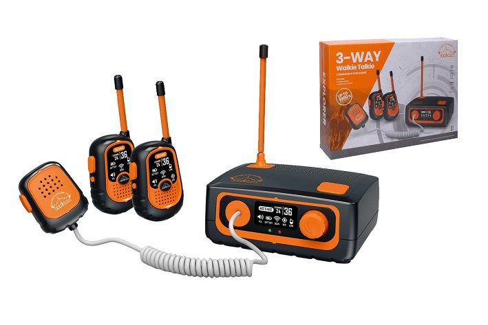 Vysílačky se stanicí. Rozměr stanice 17x11x6,5 cm. Dosah 300 m. Součástí 2 vysílačky, vysílací stanice. Stanice má nastavení hlasitosti. 1x9V baterie pro stanici a každou vysílačku nejsou součástí.