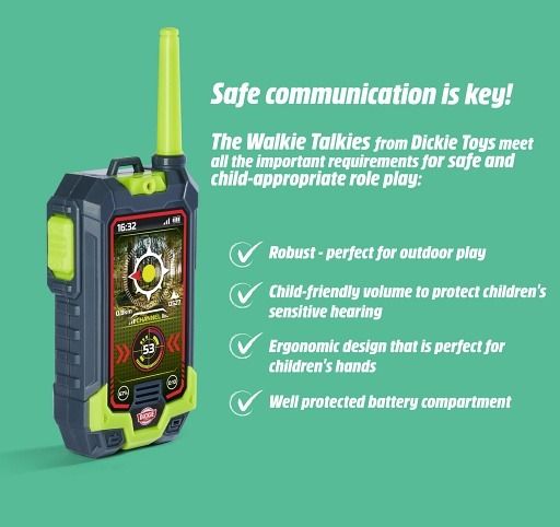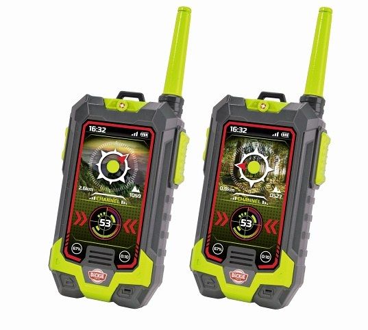 Dětské vysílačky s frekvencí 434 MHz a ovládací vzdáleností 400 m, 2 ks v setu. Barva zelená/šedá. Velikost 16 cm.