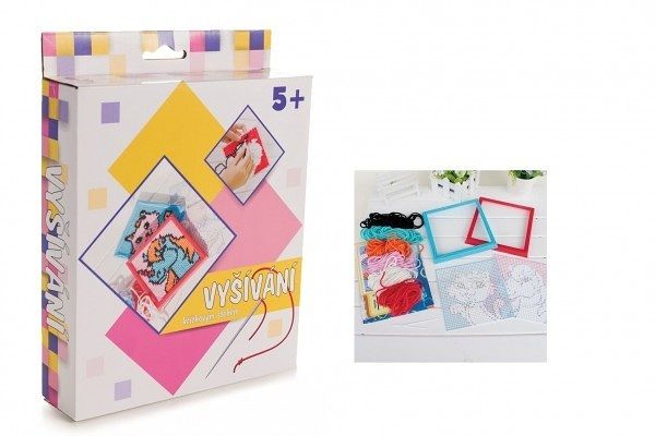 Děti si mohou křížkovým stehem vyšít dvě předtištěné předlohy, dále balení obsahuje 2 umělé jehly, 2 plastové rámečky, 6 barevných bavlnek a návod.