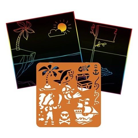 Vyškrabávací obrázky s motivy pirátů skryté pod černým podkladem. Pomocí odnímatelné šablony s obrysy obrázků a dřevěného škrabátka (je součástí balení) následně vytvořené a vyškrabané obrázky odhalíte. Omalovánky obsahují 24 listů. Gramáž 400 g. Vhodné pro děti od 5 let,,Rozměry balení: 15 x 20,5 cm.