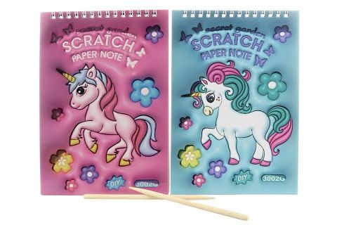 Vyškrabovací sešit s kroužkovou vazbou. obsahuje 8 černých listů s barevným podkladem, kde si dítě může namalovat obrázek dle vlastní fantazie. Součástí je vyškrabovací dřevěné pero.Baleno v sáčku. Rozměry 14x20 cm. Výrobek není hračka.