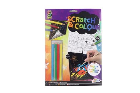 Balení obsahuje 15 archů A5,z jedné strany lze seškrbávat obrázek a z druhé strany vybarvovat.Součástí vyškrabovátko a pastelky 4 ks.Rozěmr balení cca 22 x 30 x 1 cm.Věk 3+