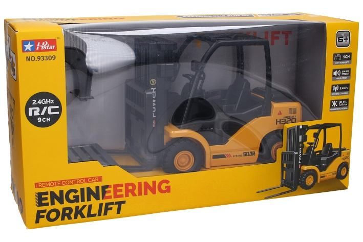 Vysokozdvižný vozík RC na dálkové ovládání. Rozměry 34x12,5x18,8 cm. Frekvence 2. 4GHz. Zvukové efekty. Bateriový pack 3. 7V do vozíku součástí, 2xAA do ovladače nejsou součástí. USB kabel, paleta, adaptér s hákem součástí. Přepínač ON/OFF na spodní straně vozíku. Ovladač - přepínač ON/OFF, pohyb dopředu a dozadu, otáčení vlevo a vpravo, tlačítko zvukové efekty, tlačítko vypnutí zvuků, tlačítko DEMO, tlačítko zvedání nakládací plochy, tlačítko pokládání nakládací plochy.