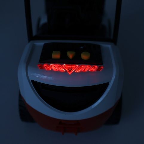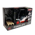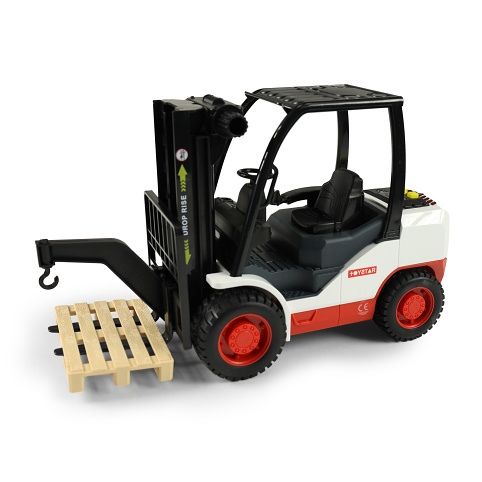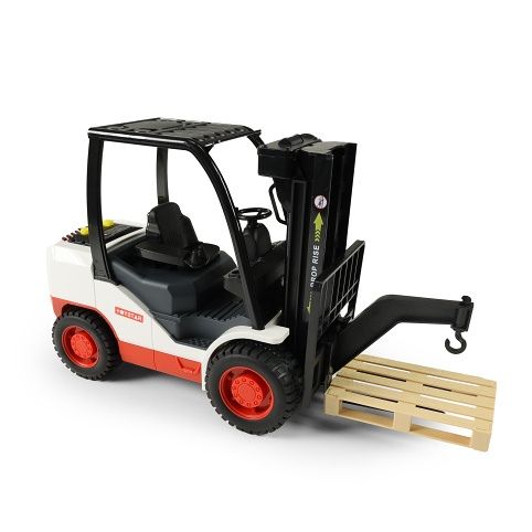 Vysokozdvižný vozík s manuálně pohyblivými částmi. Vozidlo má pogumovaná kola, která zlepšují jeho jízní vlastnosti. Je vyrobeno z kvalitních plastů, jezdí na setrvačník a jeho délka je 30 cm. Pomocí tlačítek aktivujeme světelný a zvukový efekt, je nutné použití 3 ks baterií typu AG13, které jsou součástí balení.