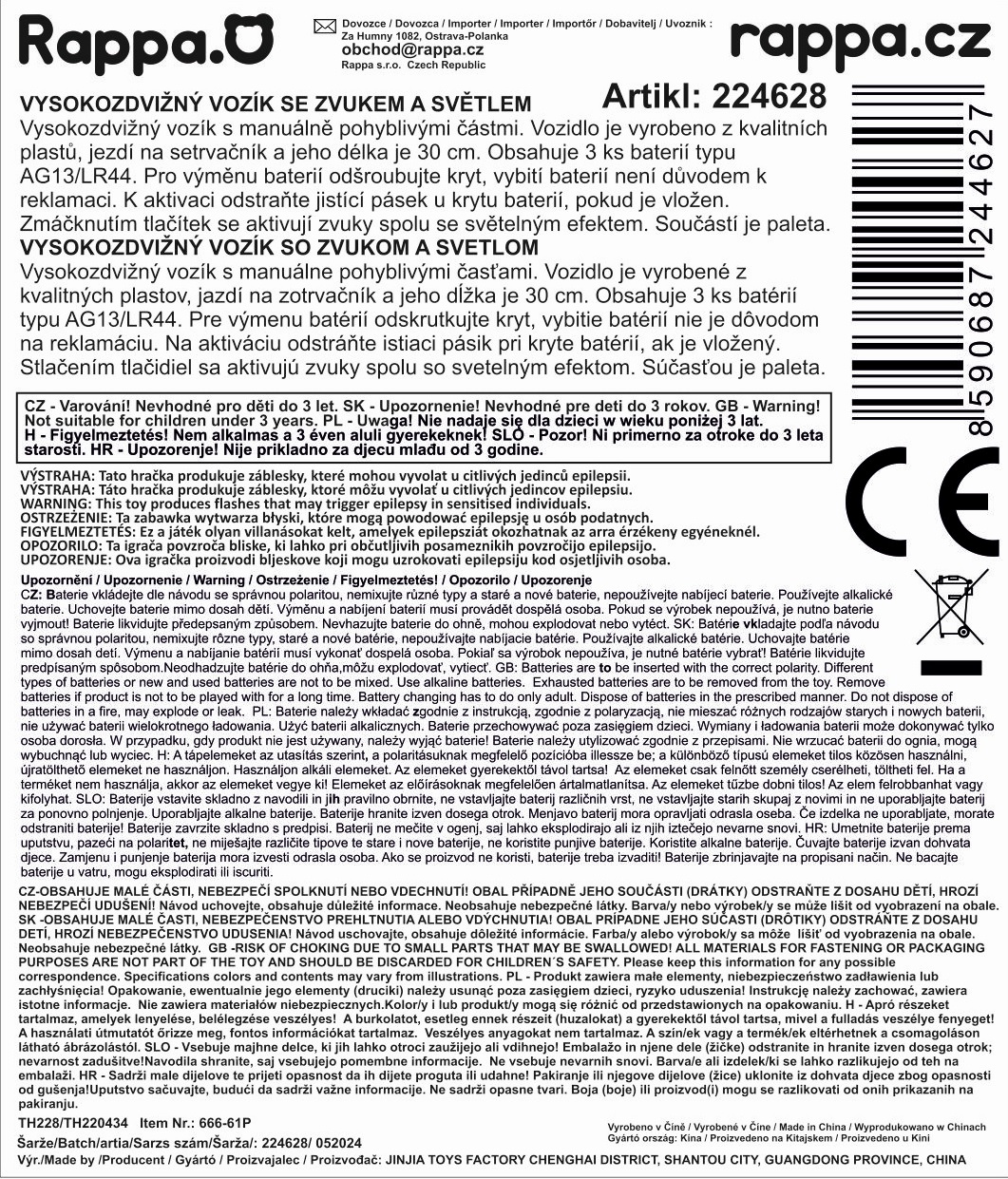 Vysokozdvižný vozík s manuálně pohyblivými částmi. Vozidlo má pogumovaná kola, která zlepšují jeho jízní vlastnosti. Je vyrobeno z kvalitních plastů, jezdí na setrvačník a jeho délka je 30 cm. Pomocí tlačítek aktivujeme světelný a zvukový efekt, je nutné použití 3 ks baterií typu AG13, které jsou součástí balení.