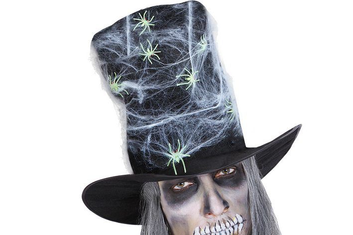 Vysoký černý cylindr s šedivou pavučinou a pavouky
