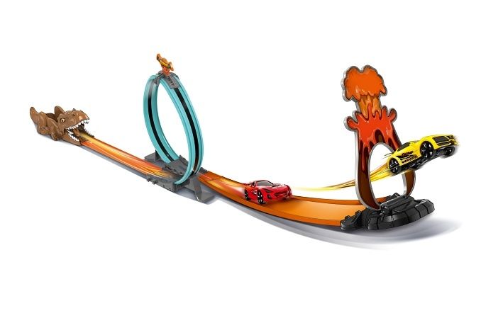 Vystřelovací dráha dino s autem. Rozměry 106x17x30 cm. Součástí 1 auto, volná kola.