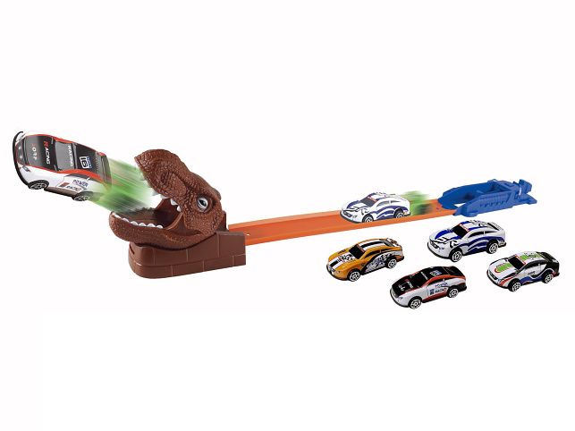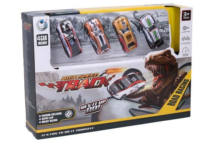 Vystřelovací dráha dino se 4 auty. 4 kovová auta. Rozměry 45x12x16 cm. Sestavte dle obrázku na zadní straně obalu.