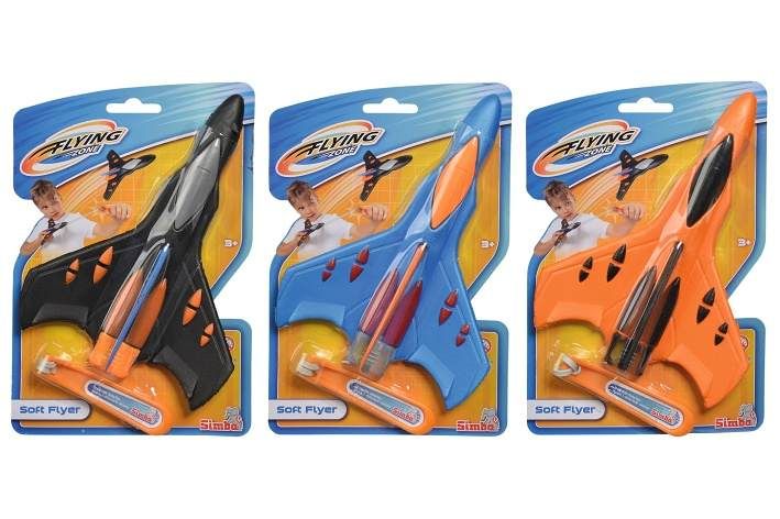 Vystřelovací letadlo z měkkého, lehkého materiálu. Vystřelování pomocí pružného pásku. Velikost 20 cm. 3 barevná provedení.