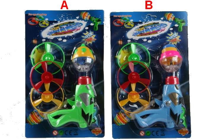 Vystřelovací pistolka o velikosti cca 11 cm X 10 cm na vystřelování vrtulek - 3 ks v balení - o velikosti cca 7 cm nebo můžete použít na vystřelení a roztočení káči na zemi.Káča se roztočí a svítí.Věk 3+