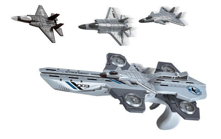 Vystřelování stíhaček. Rozměry pistole 30x15,5x12 cm. Součástí 3 stíhačky 12 cm. Bez baterií, bez efektů.