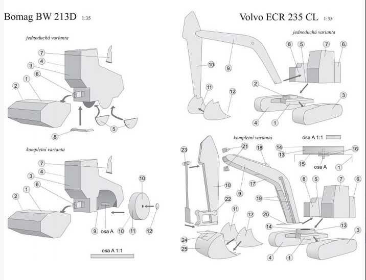 Jednoduché vystřihovánky 2 stavebních strojů. V sešitě vystřihovánky najdete pásové rypadlo s označením Volvo ECR 235 CL a dále Bomag BW 213 D.