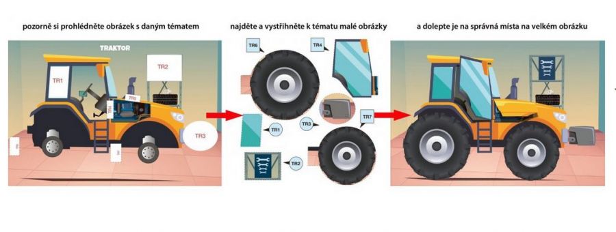 Základním úkolem je vystřihovat jednotlivé obrázky v jednoduchém obrysu a dolepit je správně do prostředí na odpovídající místo.