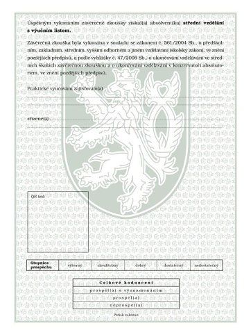 Vysvědčení o závěrečné zkoušce (střední vzdělání s výučním listem) - tříleté obory pro tisk QR kódu.