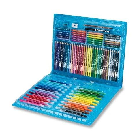 Souprava 100 kusů pastelek, fixů, voskovek a příslušenství pro začínající umělce v praktickém balení v boxu.