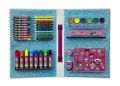 10 voskovek, 10 pastelek, 8 fixek, 6 vodových barev se štětečkem, pravítko, gumu, ořezávátko, 20 šablon k vybarvení, 4 listy samolepek.