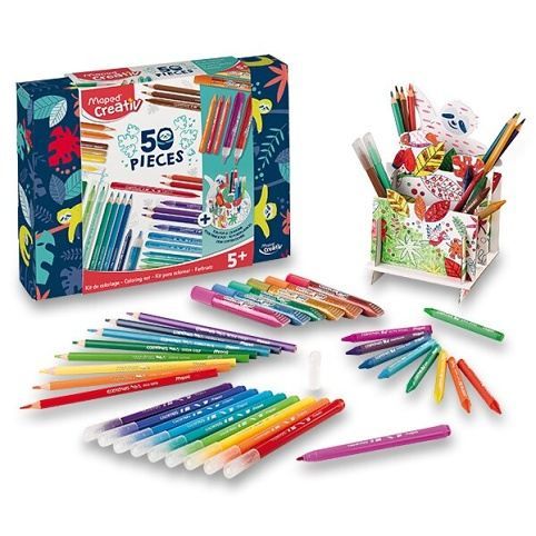 Kufřík s výtvarnými potřebami v přitažlivé paletě barev obsahuje 16 pastelek, 12 fix, 6 lepidel se třpytkami a 16 voskovek. Součástí kufříku je i kartonový box k vybarvení, který lze použít například jako stojánek na tužky a pastelky. Kufřík s výbavou je vvhodný pro děti od 5 let.