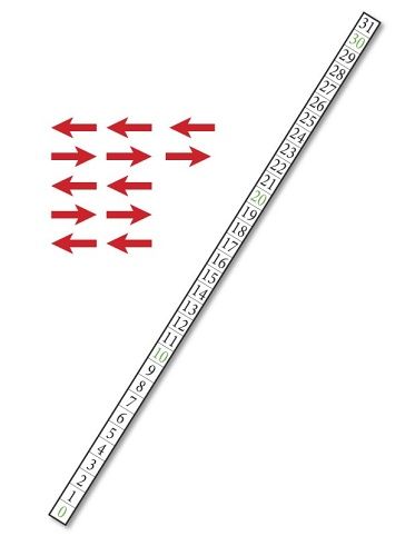 Magnetický kalendář se přichytí většinou na zárubně dveří. Pomocí červených šipek rozlišujeme desítky a číselné řady (vzestupně i sestupně).