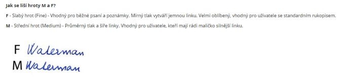F - Slabý hrot (Fine) - Vhodný pro běžné psaní a poznámky. Mírný tlak vytváří jemnou linku. Velmi oblíbený, vhodný pro uživatele se standardním rukopisem.