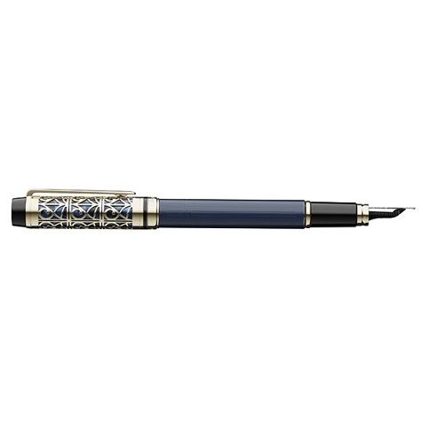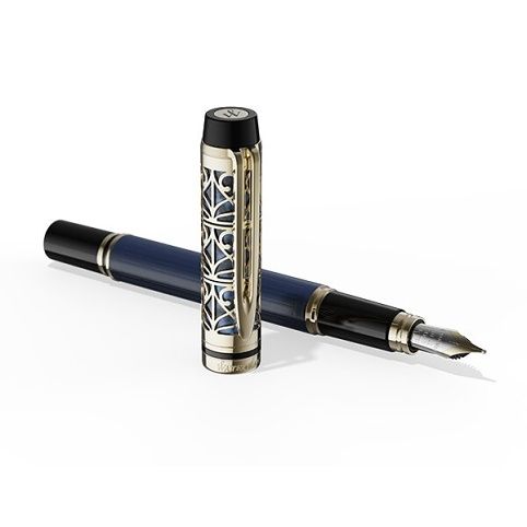 Plnicí pero Waterman Man24 Blue LE z limitované edice Man Bleu de Paris má modře lakované mosazné tělo. Víčko zdobí elegantní kovová klec evokující motiv pařížských balkónů potažený světlým zlatem, doplněné o lakování modře perleťovou pryskyřicí. Pero má ikonický dvoubarevný hrot z 18karátového zlata.