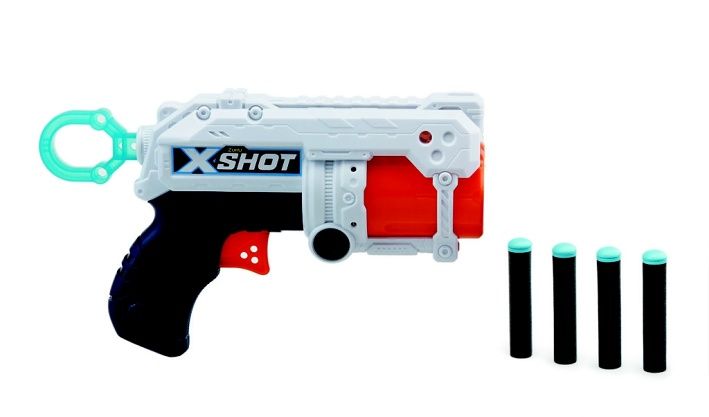 Toto je zbraň pro opravdové střelce. Díky otočné hlavni můžete rychle vypálit 4 náboje na vzdálenost až 27 metrů. Předností této zbraně je také velká přesnost. Věk: 8 +. Obsah: zbraň a 16 nábojů.