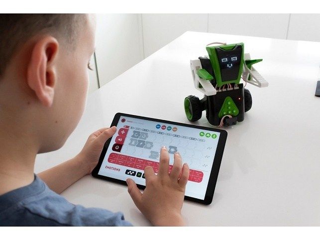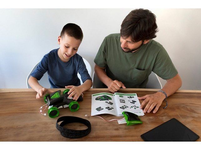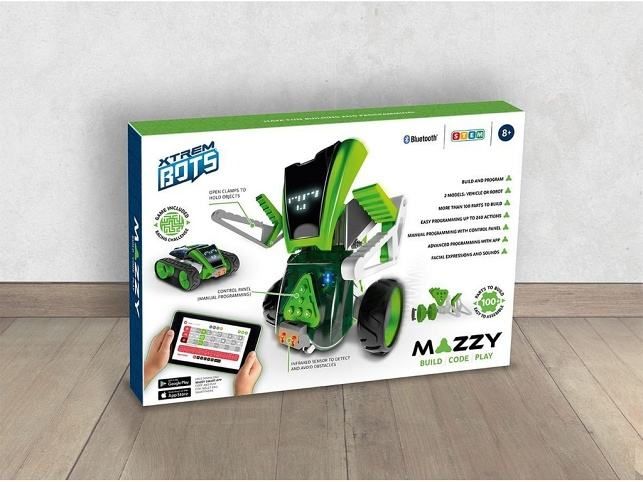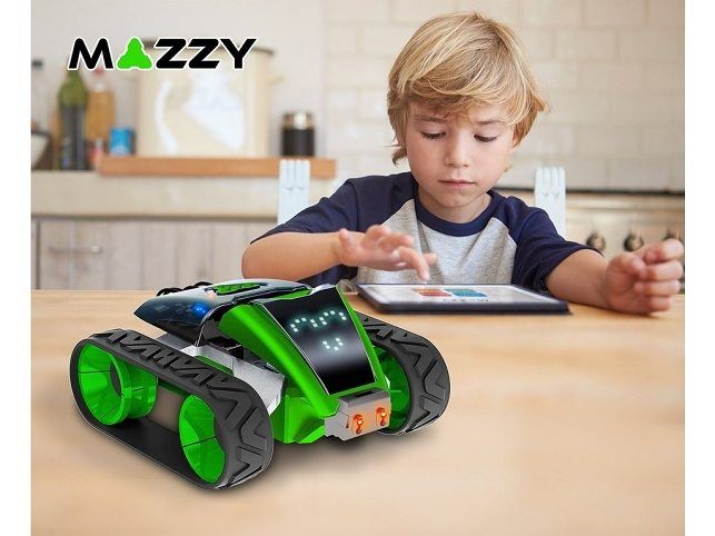 SKVĚLÁ ZÁBAVA SE SKLÁDÁNÍM A PROGRAMOVÁNÍM. MAZZY je robot navržený pro začátek výuky ROBOTIKY Snadným, zábavným a kreativním způsobem umožňuje učinit první kroky v programování. Stačí šroubovák a podrobný návod k sestavení, aby si dítě mohlo užít nevšední zážitek se stavbou robota. MAZZY se skládá z modulárních dílů, které umožňuji sestaveni 2 různých modelů: ROBOTA a OFF-ROAD VOZÍTKA. MAZZY bude následovat příkazy naprogramované dítětem prostřednictvím kontrolního panelu umístěného na robotovi (pohyb) nebo prostřednictvím aplikace (pohyb, výrazy, zvuky, hudba a závody). Mazzy - robot. Stavebnice robota 100 dílů. Manuální programování přímo na robotovi a interaktivní programování v aplikaci iOS nebo Android. 240 akcí, senzor detekce překážek. Možnost sestavení dvou různých typů robotů (s koly nebo s pásy). Zvuky, změna výrazu obličeje. Klíčové vlastnosti: Sestav a programuj, 2 modely - vozítko nebo robot, Více než 100 dílů, snadné programování až 240 akcí, programování pomocí kontrolního panelu, pokročilé programování s aplikací, mimika obličeje a zvuky. Napájení bateriemi 4 x AA 1,5 V (baterie nejsou součástí).