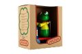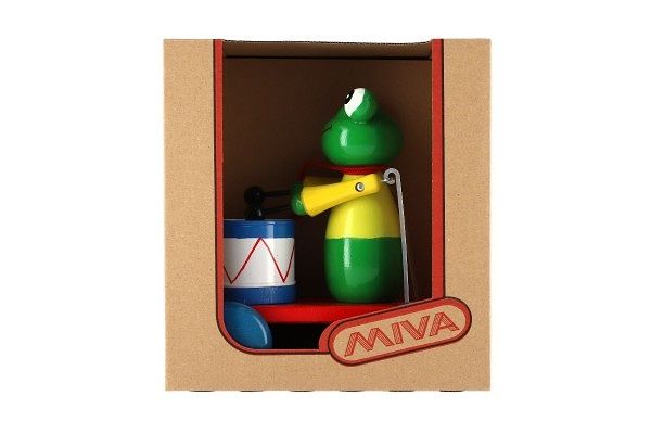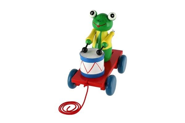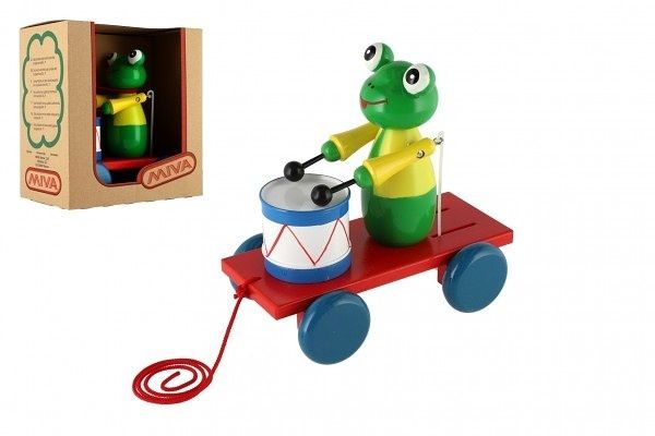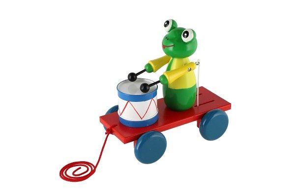 Žába s bubnem barevná dřevo tahací 19cm v krabici 20x21x12cm