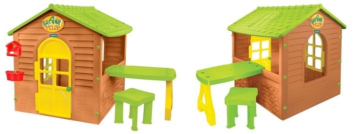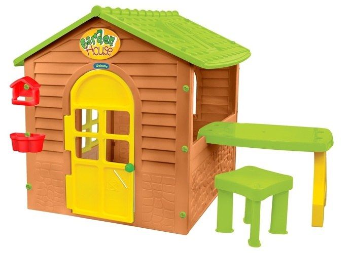 Zahradní domeček se stolkem a židličkou. Domeček má zavírací dvěre a okna. Obsahuje příslušenství – stoleček, židličku a polepky. Velikost domečku 122,5×120×120,5 cm. Vyrobeno z vysoce kvalitního plastu v EU.