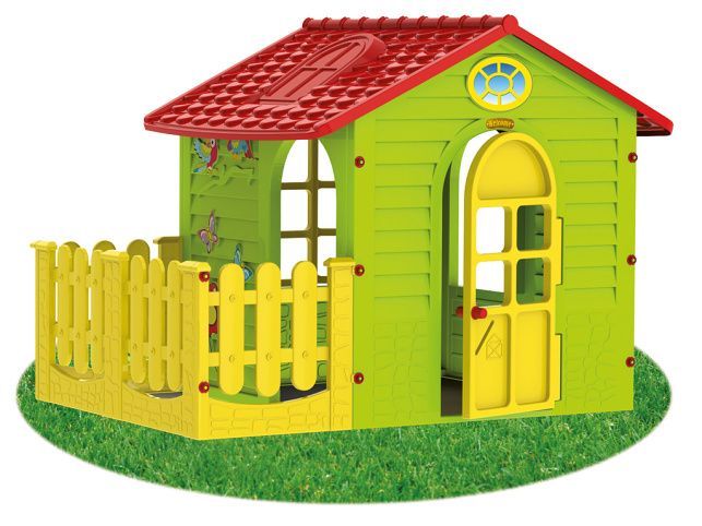 střechou,žlutými zavíracímí dveřmi a okny s plotem.