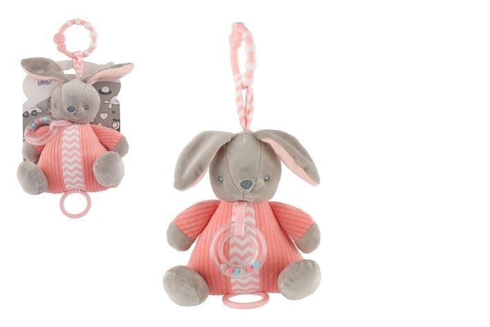 Zajíc natahovací hrací strojek s chrastítkem plyš 18x20cm růžová na kartě v sáčku 0+