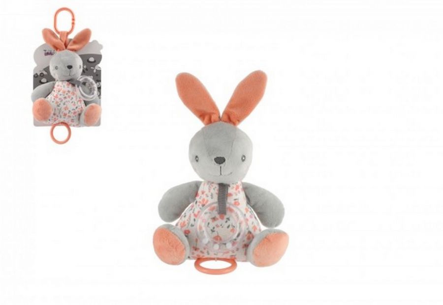 Natahovací plyšový zajíček hraje příjemnou melodii, která miminko uklidní a pomáhá mu při usínání. Hračku lze zavěsit za pomocí klipu na postýlku nebo kočárek. Hrací strojek je zabudovaný uvnitř zvířátka a plastové kolečko slouží jako natahovací klip. Rozměry balení 17 x 21,5 x 10 cm Vhodné pro děti od narození.
