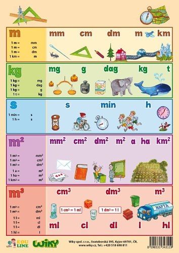 Obsah přední strany tvoří jednotky délky, hmotnosti, času, obsahu a objemu, s převody jednotek a s názornými ilustracemi. Ilustrace jsou zvoleny co nejtypičtěji, aby vedly k jejich snadnému zapamatování a také umožňovaly provádět odhad délky, vzdálenosti, hmotnosti,času, obsahu a objemu. Zadní strana je shodná v ilustracích s přední a slouží k procvičování.