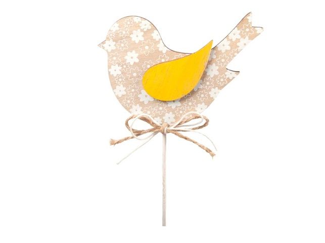 Zápich ptáček ze dřeva v krémové barvě. Ptáček má žluté křidélko a je ozdobený bílými květy. Zápich je ideálním doplňkem do Vašich jarních truhlíků nebo kytky ve váze. Barva: krémová Materiál: překližka Celková délka zápichu: 310 mm Uvedená cena je za 1 ks.