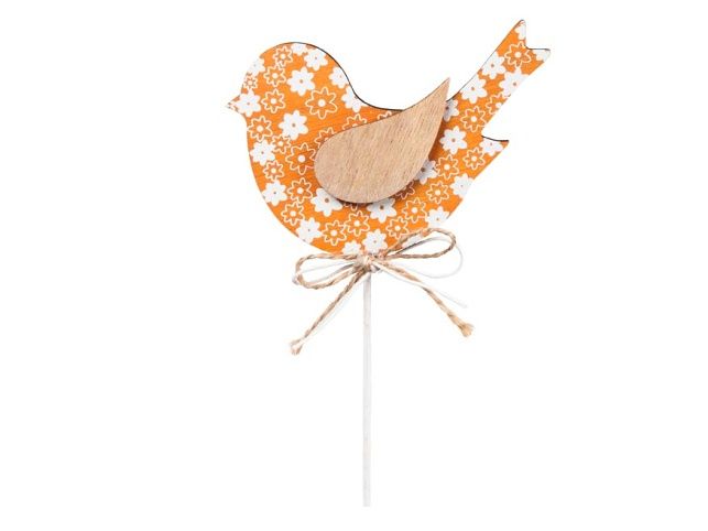 Zápich ptáček ze dřeva v oranžové barvě. Ptáček má křidélko v přírodní barvě a je ozdobený bílými květy. Zápich je ideálním doplňkem do Vašich jarních truhlíků nebo kytky ve váze. Barva: oranžová Materiál: překližka Celková délka zápichu: 310 mm Uvedená cena je za 1 ks.