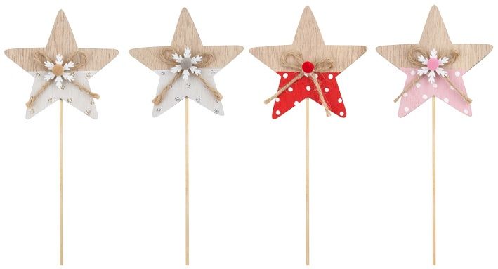 Dekorace na zapíchnutíVhodná i do květináčeMalované detailyDekorace na špejli ve tvaru dřevěné hvězdy o průměru 8 cm, kterou ve středu zdobí mašlička s vločkou a barevnou bambulkou. Barevný kontrast s puntíky do její poloviny na dřevěném podkladu zápich krásně oživí.