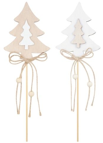 Dekorace na zapíchnutíVhodná i do květináčeDřevoDřevěná dekorace na špejli ve tvaru většího stromku, s menším v kontrastní barvě na středu. Zápich je na špejli zdoben mašličkou z provázku a dřevěnými korálky.