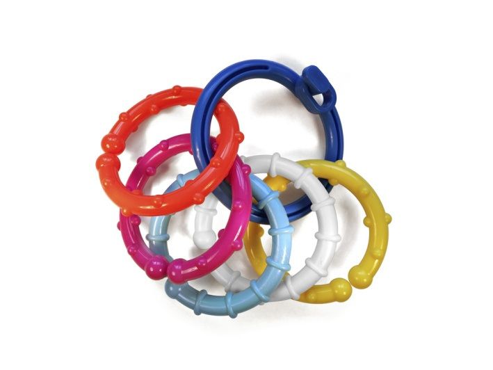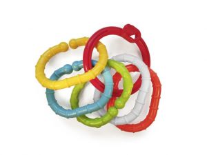 zapínací kroužek, kterým lze hračku upevnit třeba na kočárek.