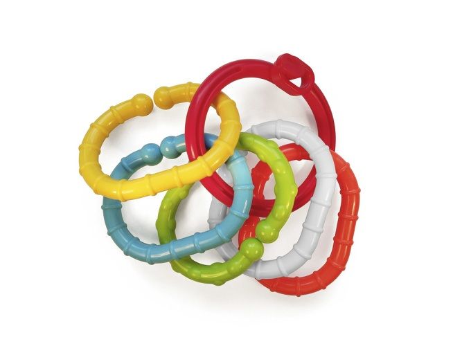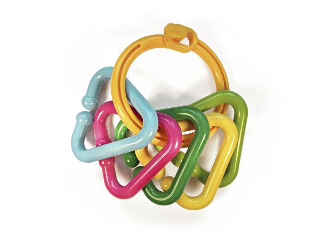 Zapínací kroužek + plastový řetěz. Hračka obsahuje 5 různobarevných